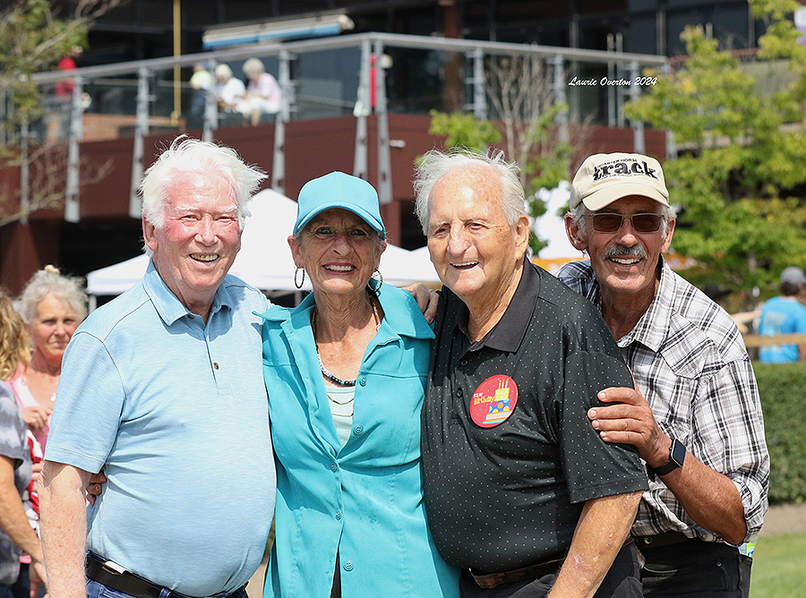 Carol Proctor and husband Wayne (far right) celebrated a big win with their filly Caraways Angel Air with one of Ontario Quarter Horse racing's founders, Ralph Pearson (second from right) and longtime owner and breeder Gary McNichol. Laurie Overton Photo