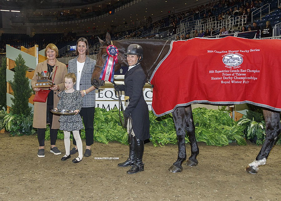 Pamela Law, Alexa Law and Hellie Law present the Prince of Thieves Go West Trophy to Isabelle Lapierre (Levis, QC) and Carrera S, as the Eastern Canadian Champions in the Canadian Hunter Derby Series. Photo Credit: Cealy Tetley