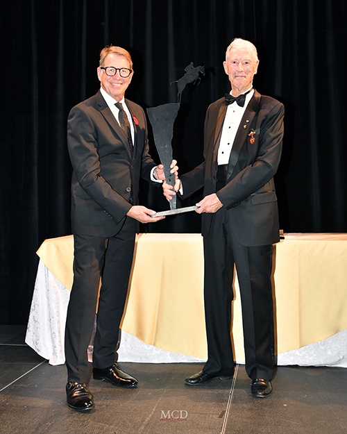 Photo at Right: Ten-time Canadian Olympian Ian Millar (right) is inducted in the Rider category by retired CBC Sports analyst, Scott Russell, at the 2025 Jump Canada Hall of Fame Gala and Induction Ceremony. Photo by Michelle C. Dunn