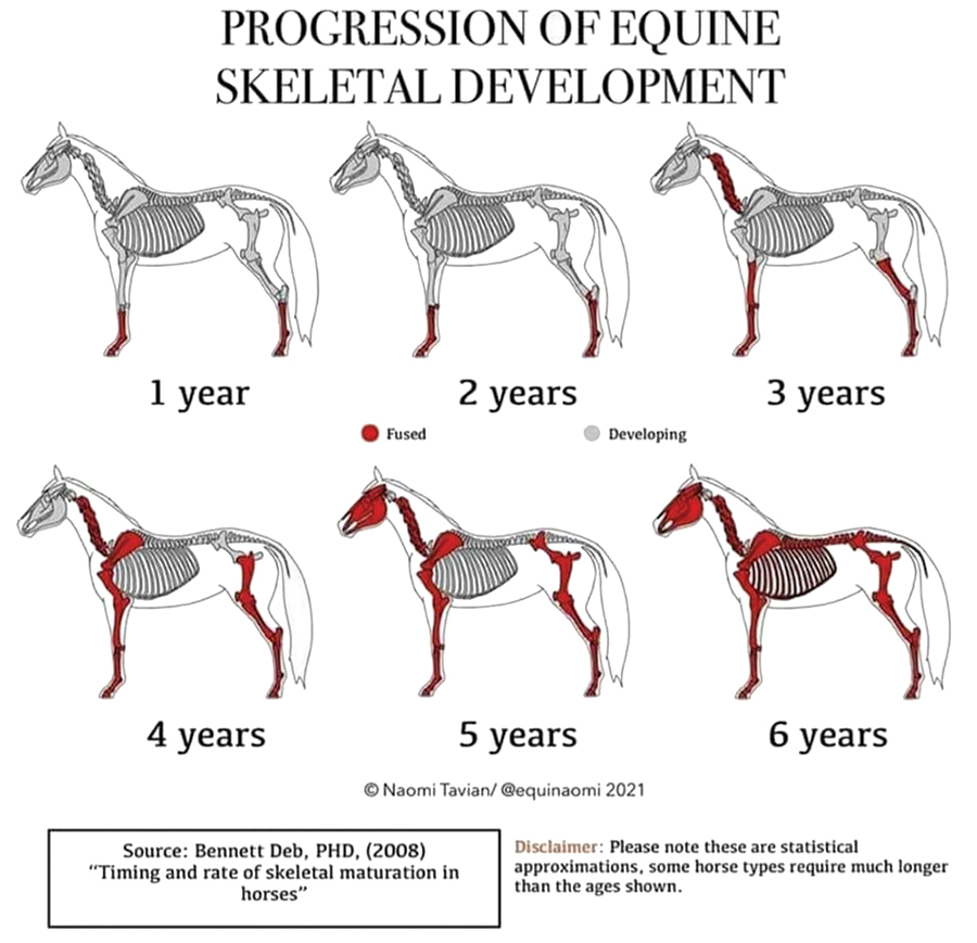 This image gives the general guidelines of how a horse matures and by what age their bones fuse together, some horse breeds may take longer or shorter but generally, a horse is not fully mature until they are around six.