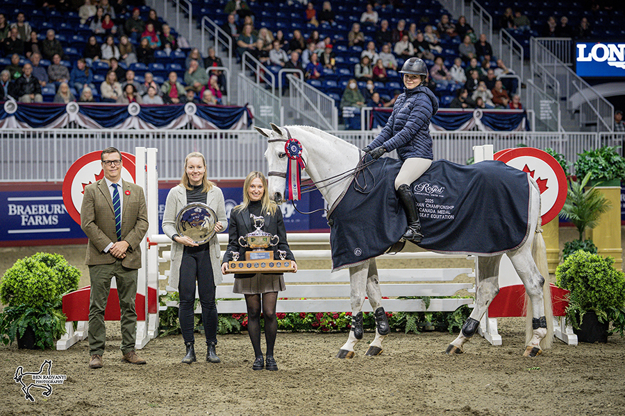 Mathilde Candele, 16, of Orangeville, ON, riding Origi vd Bisschop won the 2025 JC Medal National Final on Tuesday, November 11, at the Royal Horse Show in Toronto, ON. Pictured standing (from left to right) is Nick Sutcliffe, Equestrian Canada Board of Directors; Kelsey McDonell, Equestrian Canada Youth Teams Coordinator; and Meghan McDonald presenting the Leslie and Elsie Usherwood Memorial Trophy. Photo by Ben Radvanyi Photography