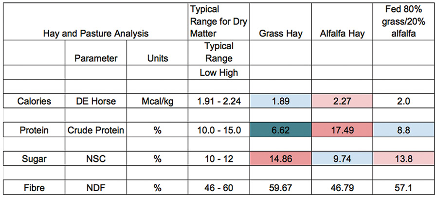 Last year, we had a hard time getting a single source of hay that met all our requirements. Our first-cut grass hay was very palatable, but it was low in protein and high in sugar. So, we supplemented this with some alfalfa hay to increase protein and calories, decrease the sugar and balance the fibre.